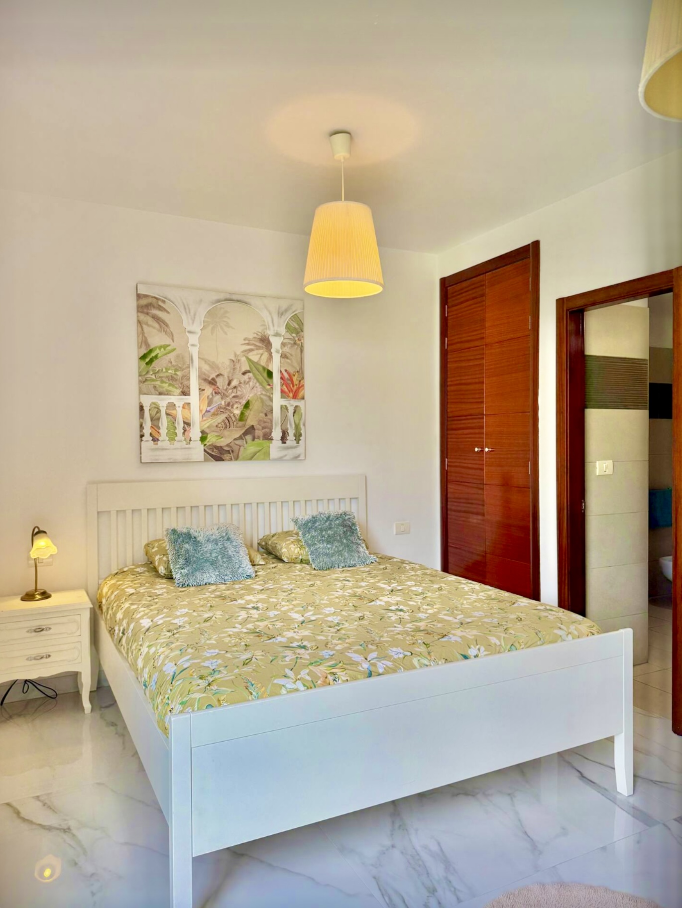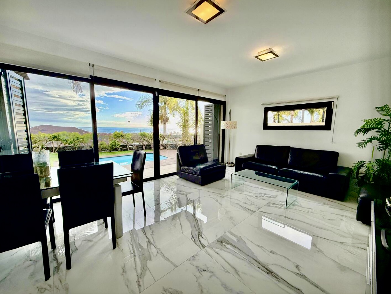 La villa está completamente equipada y decorada con mucho gusto. Cuenta con 3 dormitorios, 2 baños con ducha y 1 toilet adicional, un amplio salón con vistas panorámicas a Costa Adeje y una moderna cocina con lavavajillas, lavadora y secadora. Además, disponemos de Internet de alta velocidad, ideal para trabajar desde casa. Todas las habitaciones cuentan con aire acondicionado.
